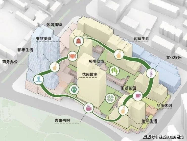 包含塔楼办公、街区办公、社区大堂、社区会所、空中社区平台、住宅及城市设施,以立体复合的空间混合模式,立体多元的生态场景体系,营造多元丰富场景体验。