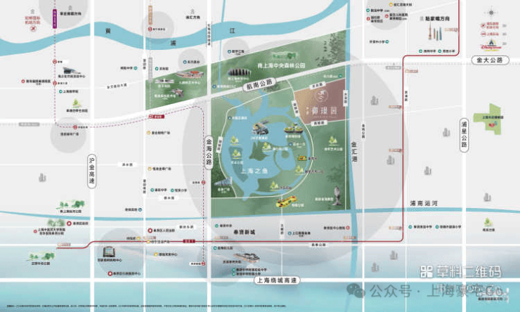 项目位于上海之鱼内,东侧是极具特色的金汇港,水脉碧波倒映生态景观。坐拥约万亩林地,占地面积约4.78平方公里南上海中央公园,更拥享上海之鱼约13公顷环湖景观带和集艺术展览、活力健身、娱乐休闲、游憩观赏为一体的现代城市公园群。