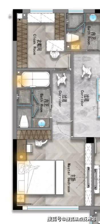 主卧是套房的格局,可以分割为卧室+L型衣帽间+大进深内卫的格局.
