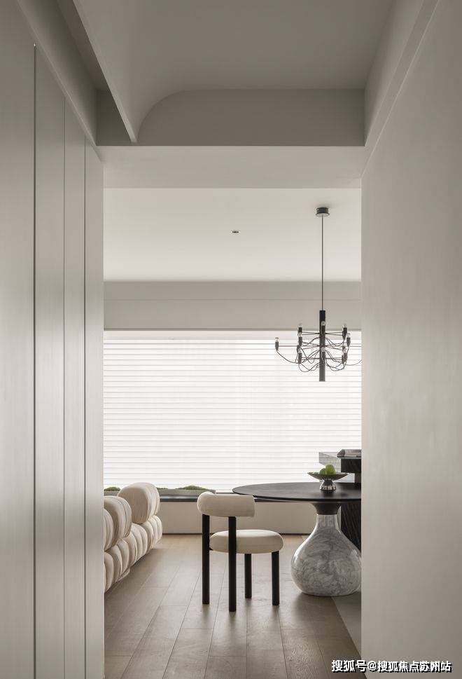 凭借温柔的弧形,优化了原始梁柱的琐碎感和锐利感,与木元素或纯色调糅合,让光影自由地流动.以玫瑰为灵感创作的单椅装点一隅,贵雅无比,茶几以叠层魅力与之对话,达成酝酿风雅的共识.