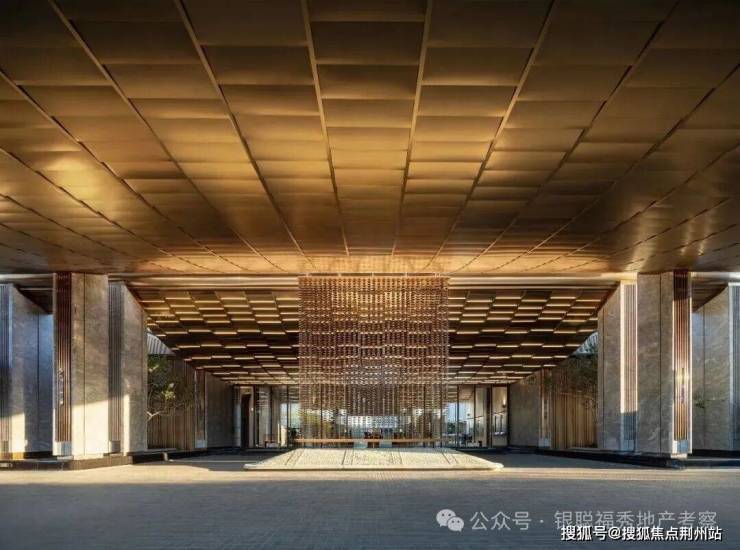门庭以古代冠冕为设计灵感,呼应“凤起之地”城市贵脉,将东方檐宇的曲线美学与现代材质工艺相融合.印度库班绿花岗岩与威尼斯棕大理石铺就万字纹地坪,如展开的奢华长卷,静候归人.门庭中央,一幕宽达约6米的冕旒垂帘悬于半空——6045颗景泰蓝旒珠如星河垂落,延续“隔而不断”的东方造园智慧.