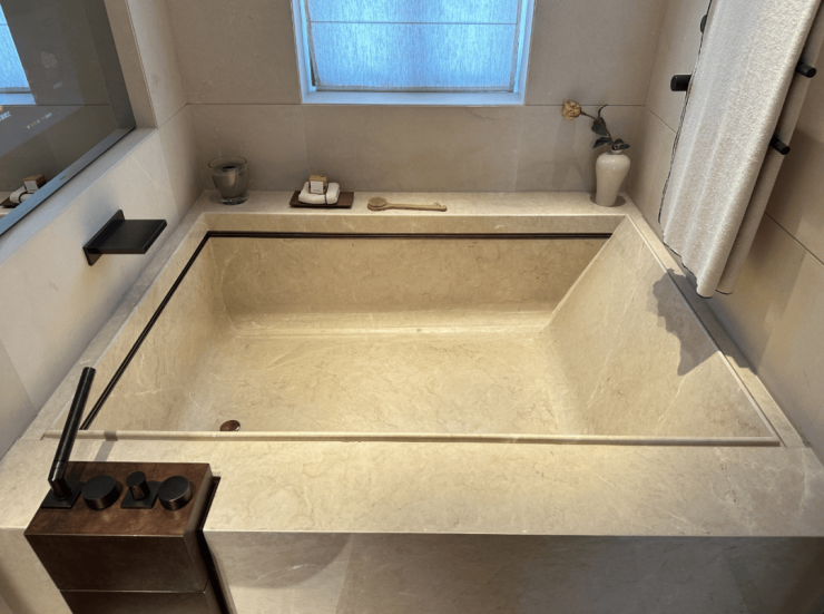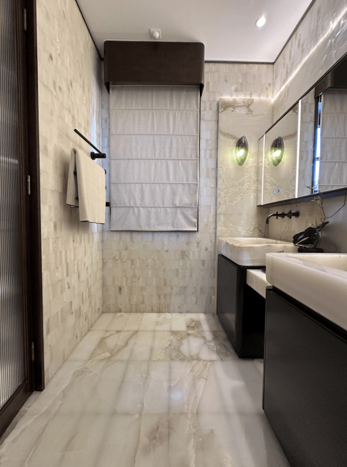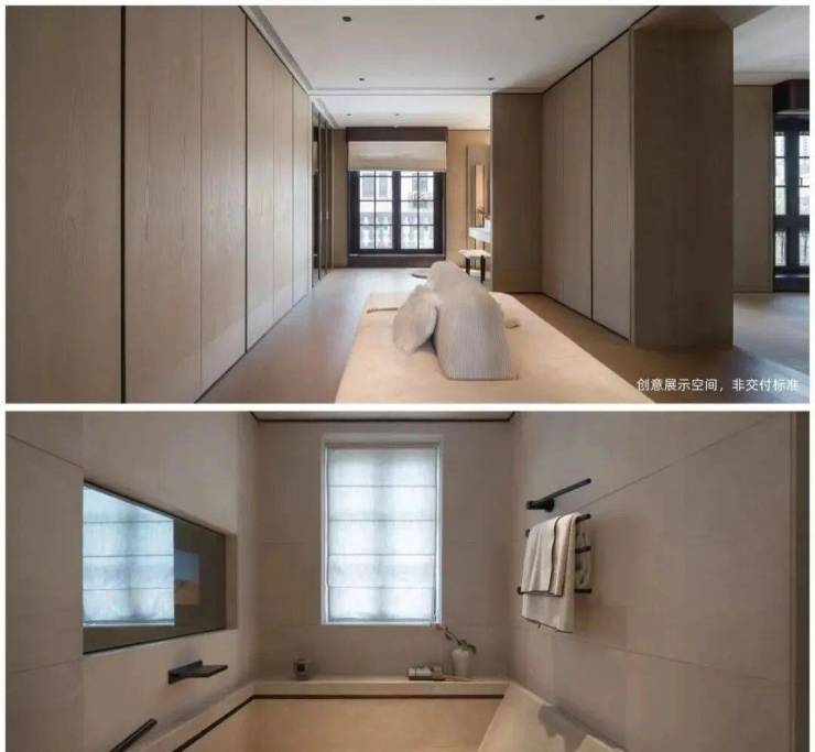 而样板间里这第二个卫浴空间,更接近于享受级.嵌入式浴缸,设计了魔镜系统,可以供业主泡澡时观影娱乐;除此之外,这个卫生间也有独立的淋浴房,并设计有桑拿房.