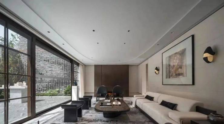 整体一层空间的东南方向,样板间设计为了茶室,配合西向落地玻璃窗,同样正对庭院.