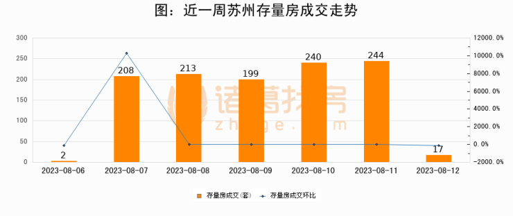 从存量房来看,2023年08月12日苏州存量房单日成交17套,比昨日减少227套,环比下降93%。从近一周存量房成交来看,苏州存量房日均成交套数为160套,08月12日单日成交17套,低于近一周平均水平89.4%。