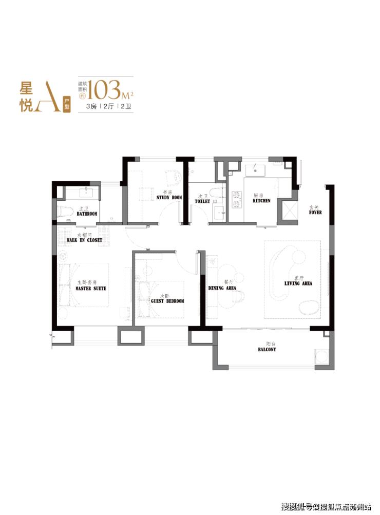 项目约103-107㎡3房2卫设计,有着 宽绰的大横厅设计,并且3.5开间朝南。