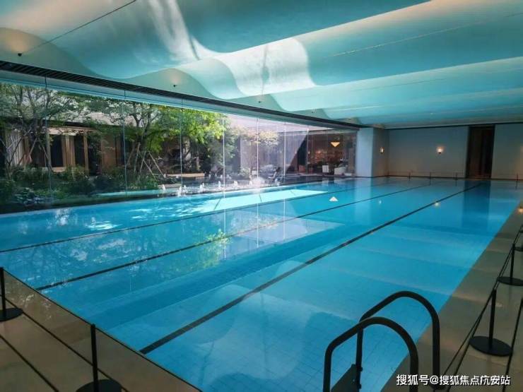 最后来看泳池。云邸玖章做了再升级。改为采用大尺度的落地玻璃拼接,约2.4米宽巨幅玻璃,且通过精致的玻璃交接细节处理增进室内外空间的融合,强调泳池的无界感,真正实现了无边泳池的效果、质的飞跃。