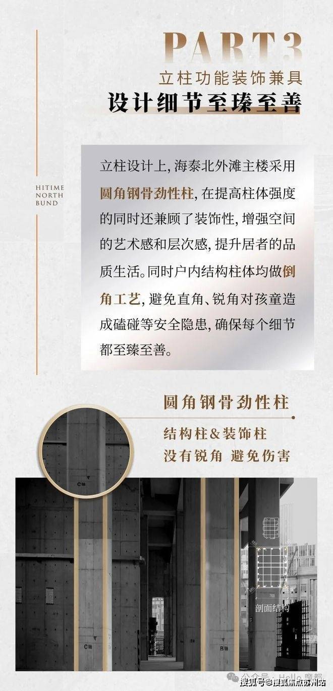 在结构安全方面,海泰充分吸取国内外经验,结合所处城市以及地块的地质条件,进行充分论证,对地基和基础、梁、板、柱等关键部件的设计与施工,都进行了更多安全方面的专业考量.比如,设计了框架体系、核心筒体系和安全屋等多道抗震设防体系,主楼采用直径800毫米桩长60米的钻孔灌注桩,间距2400毫米,呈梅花形布置,桩端采用后注浆技术,进一步提高桩身承载力;主楼结构柱采用圆角钢骨劲性柱,户内结构柱均做倒角工艺,安全与美观兼具.此外,海泰还在主楼的部分核心筒剪力墙内设置了型钢钢板,控制墙体截面面积;200-300mm的楼板厚度,远超常规120mm厚度的楼板,既安全又隔音.