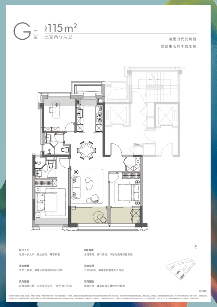 115户型玄关配置步入式800库,提升收纳功能;客餐厅打造LDKB空间,南北通透,空间宽敞;U型厨房操作流畅,收纳合理。在出色的实得率之下,实现越级的居住尺度,适合对品质有更高要求的家庭。