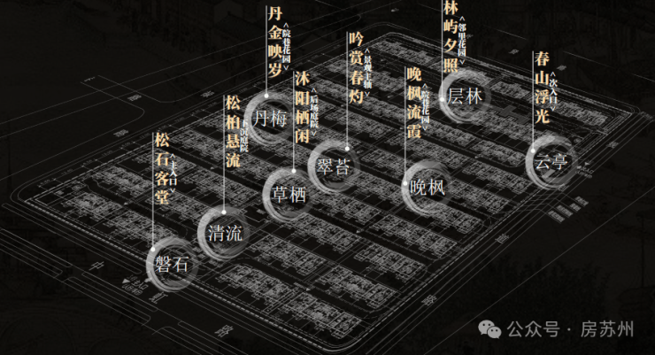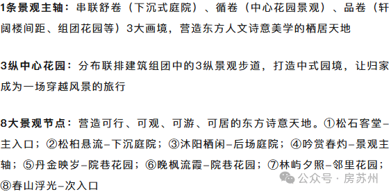 大区营造1轴3心8大景观。以“京杭古韵,繁华姑苏”为设计主题,汲取<姑苏繁华图>八景的东方设计美学语言,营造闲适自在的山水园林度假氛围。