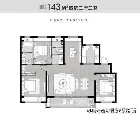 约7.5米的大横厅很耀眼,是个尺度不一般的户型;可以称得上4开间朝南,主卧为大套房;所有卧室都有飘窗,全屋6个飘窗,得房率赞赞的;非常适合三胎家庭。