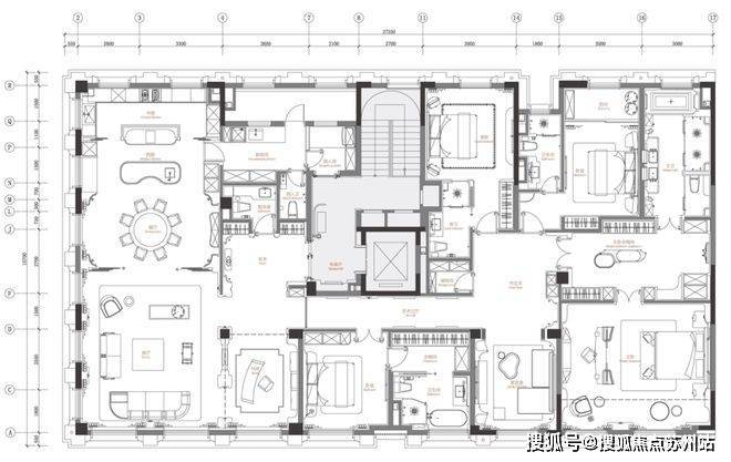 整个户型十字中轴的布局,方正无比的格局,卧室全套房的设计,27米的南向面宽……无论是功能性还是尺度感都足以承载一个大家族的居住和传世需求!