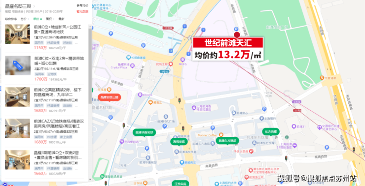 世纪前滩天汇均价约13.2万/㎡,浦东前滩次新房很多,二手房价我们参考地段更好,房龄比较新的晶耀名邸三期。