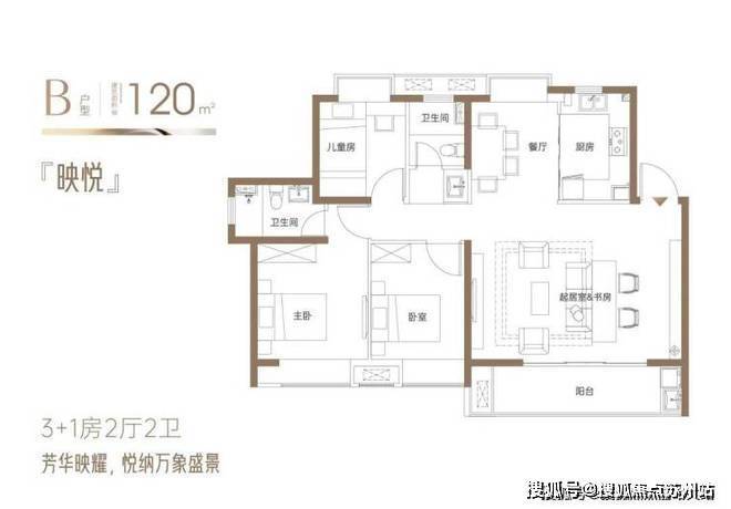 『映悦』约120㎡3+1房2厅2卫:3+1灵动空间为成长型家庭定制,容纳万象;奢阔横厅,阳光与美景,映见人生宽境;客厅与开放式书房相融,开启生活格调;IMAX巨幕观景阳台,邂逅流动的四季诗意;四面宽向阳·全明格局·全系飘窗,向美而居。