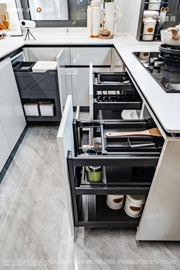 与此同时,项目在智能化方面下足了功夫,油烟机感应触控、燃气灶具有防干烧功能,60秒干烧会自动熄火关气,智能化的同时更注重居家的安全。