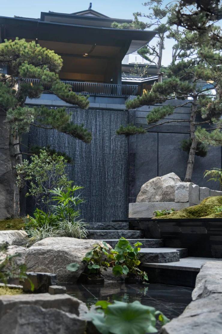 在园林设计中,还原留园的古木交柯之景,通过门-庭-巷-院-宅五进礼序收放自如,以游廊串联亭台楼阁等元素,于咫尺天地营造了可居可游的立体山水园林。