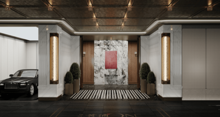 此外,相较于常规顶豪中奢石的简单铺贴,绿城黄浦ONE注重石材的艺术化设计——通过精心设计的拼花设计与错落有致的造型组合,赋予石材墙面艺术表现力;