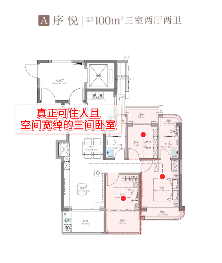 首先,项目凭借着3阳台的设计,给到客户一个真正的三房户型:先来看在其他百平米3房户型中,只能作为一间书房的北次卧: