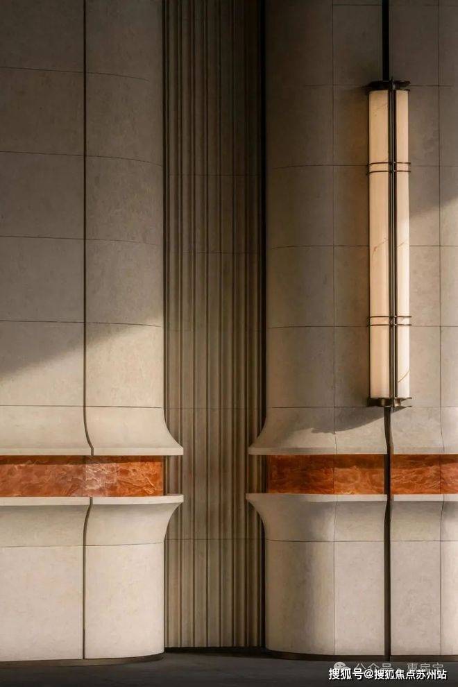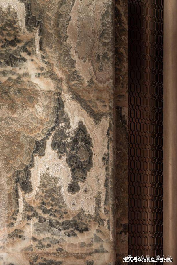 顶部定制发光云石亚克力与圆弧形的古铜色铝板交相辉映,8个西班牙宫殿沉香米黄石柱提升了尊崇感,漫步其间,揽风入怀,树影斑驳映入眼帘,水声潺潺入耳,归家的轻松感油然而生,笔者随手一拍,都非常的出圈。