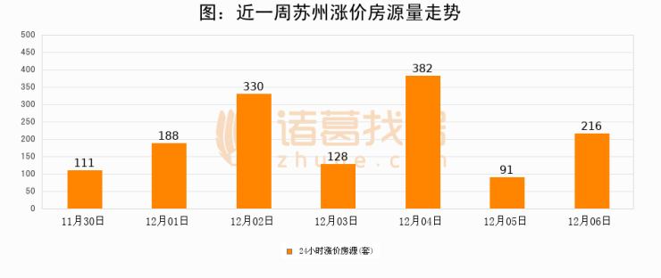 根据诸葛找房数据显示,苏州24小时涨价房源量为216套,较12月05日增加125套,环比上涨137.4%。与此同时,涨价房源占比小幅扩大,业主信心有所提升。