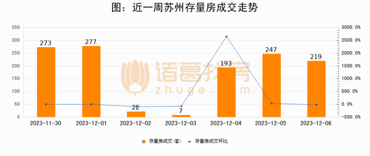 从存量房来看,2023年12月06日苏州存量房单日成交219套,比昨日减少28套,环比下降11.3%。从近一周存量房成交来看,苏州存量房日均成交套数为176套,12月06日单日成交219套,高于近一周平均水平24.4%。