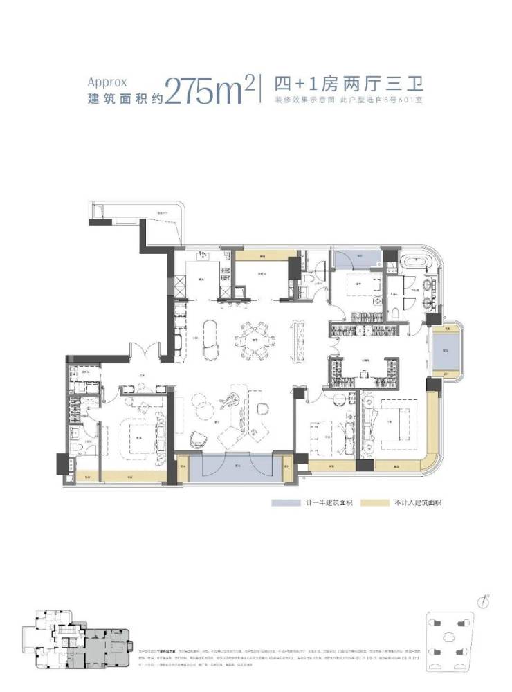 建面约275㎡4+1房户型,以约22米南向极致面宽,实现了超越市面400㎡级大平层的采光尺度,约80㎡奢阔餐客通厅搭配7.2米客厅开间,形成无界通透的社交聚场,既容得下三餐四季的烟火日常,也撑得起家族宴请的排场体面。