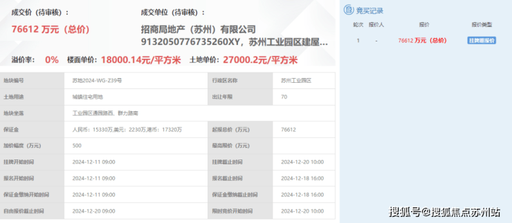 2024年12月20日,招商&建屋拿下苏地2024-WG-Z39号地块,成交楼面地价18000元/㎡,成交总价约7.66亿。容积率1.5