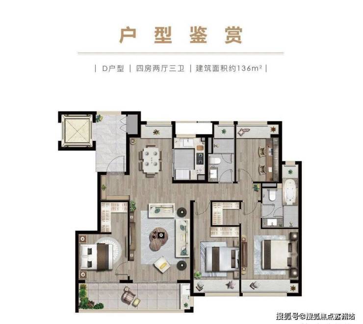 约136㎡户型,面积大,亮点多!主卧套房+带衣帽间次卧+卧室+客厅,全部朝南一字排开,加起来总面宽达约13.6米,采光面惊人!