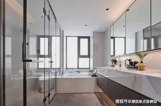 朝南大尺度飘窗带来全明采光,L型超 大衣帽空间,女主人的衣服、包包都可妥善归置。值得一提的是,主卫不仅配备了双台盆,并且还做到了四分离 设计,洗漱、淋浴、马桶、浴缸都在不同的空间,真正做到了私密而舒适。