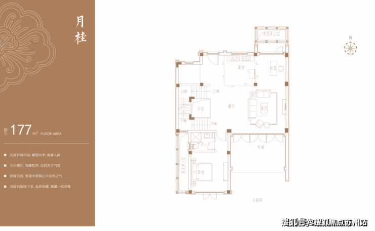 建面约175-380㎡合院:涵盖月桂(177㎡)、丹桂(185㎡)、银桂(186㎡)、金桂(205㎡)及龙梅(788㎡)。