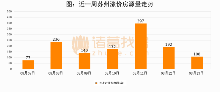 根据诸葛找房数据显示,苏州24小时涨价房源量为108套,较08月12日减少84套,环比下降43.8%。与此同时,涨价房源占比小幅回落,对于购房者来说是一个入市窗口期,购房者可抓住时机入市。