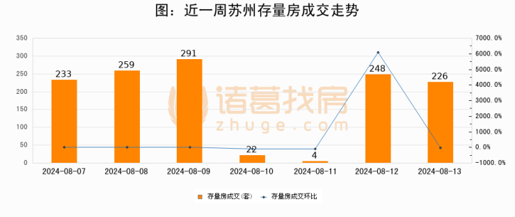 从存量房来看,2024年08月13日苏州存量房单日成交226套,比昨日减少22套,环比下降8.9%。从近一周存量房成交来看,苏州存量房日均成交套数为183套,08月13日单日成交226套,高于近一周平均水平23.5%。