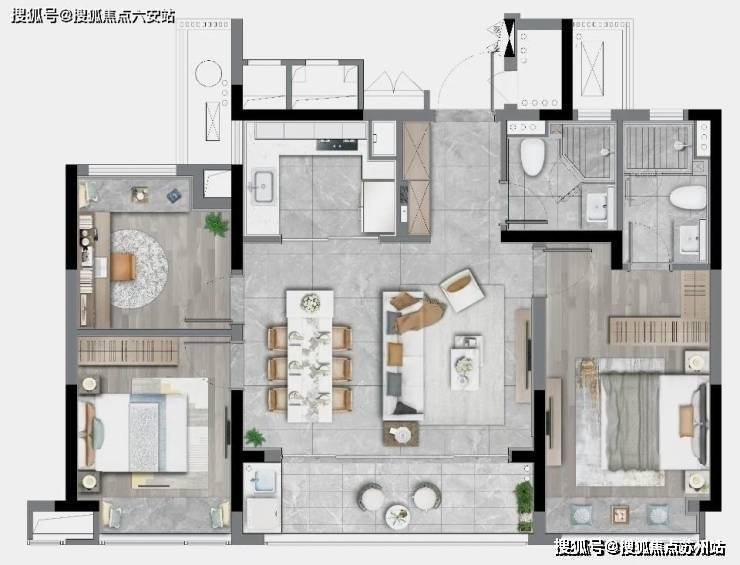 LDBK一体化的公区,充分实现了家庭成员间的互动;除了边厅外接的阳台外,南向次卧同样设计了阳台,兼顾了景观和晾晒的需求。