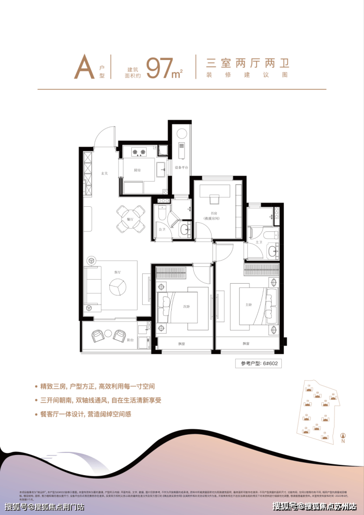 建面约97㎡做了经典的三房设计,既保障了居住的舒适度,又很好地控制了总价。