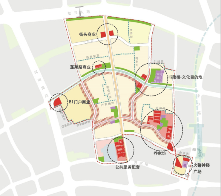 整个乔家路地块由于规模较大,总体方案设计范围:东至中华路,南至黄家路,西至河南南路,北至复兴东路,用地面积约 24.11公顷 。