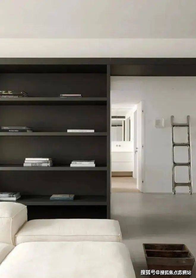 在空间塑造上,沿原次卧和公区交界的墙面,以两组深灰色烤漆书墙,形成入户后的视觉焦点,和室内的简白形成强烈的视觉冲击感。