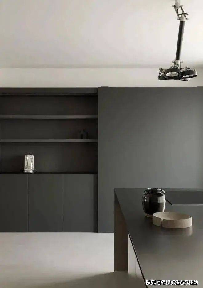 客厅沙发背后的深灰色烤漆书墙背后是书房的所在,以一扇2m长的深灰色烤漆移门控制开合,形成,形成“1+1”的可变空间组合,既满足了收纳需求,又实现了社交空间与私人空间的转换。