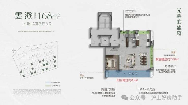 除了约9.8米的跑道阳台、4+1室的格局、约270°的IMAX超级采光面外,这个户型拥有两个最独特的优势: