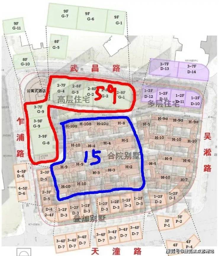 共125套住宅单元,从图示来看,全部是风貌住宅产品。以下为首开楼栋图示,59套小高层+15套合院别墅: