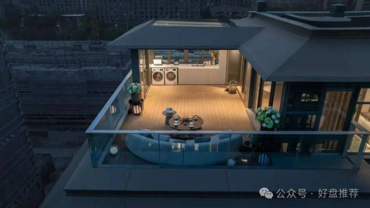 空中上叠——以“垂直立体生活”为创新理念,通过整层会客厅与双星空露台的设计,实现了功能、尺度与意境的融合。约67㎡的空中会客厅成为家庭社交与欢聚的主要场域,约40㎡的顶层星空露台则延展了生活的自然边界,兼顾观景、休闲与私享。这种既保证家庭成员私密性、又强化公共互动空间的设计,为追求品质改善的家庭提供了更优质的居住解决方案。