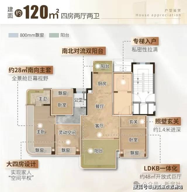 项目主推120-190㎡四房全南向板楼,以“极致空间效率+景观面最大化”革新市场: