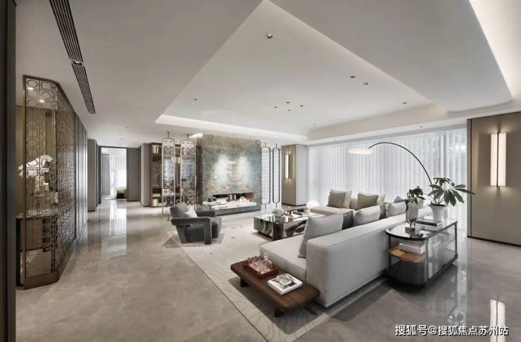 合用前室的圆弧摆饰、开放式玄关中设置“屏风”概念,拉起一道“虚实相间”的柔性感官界限。横向L型走廊无规律的自由曲线形态,串联所有空间,充满了灵动与飘逸感觉。未来生活在此,脚下是约52万方收藏级生活体的霓虹璀璨,窗前是钱塘江湾的宏大图景,无论是日常会晤、休闲聚会,亦或是高定派对、私人宴请,都将在此缓缓上演。
