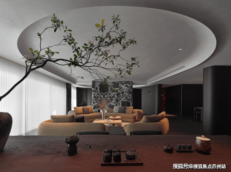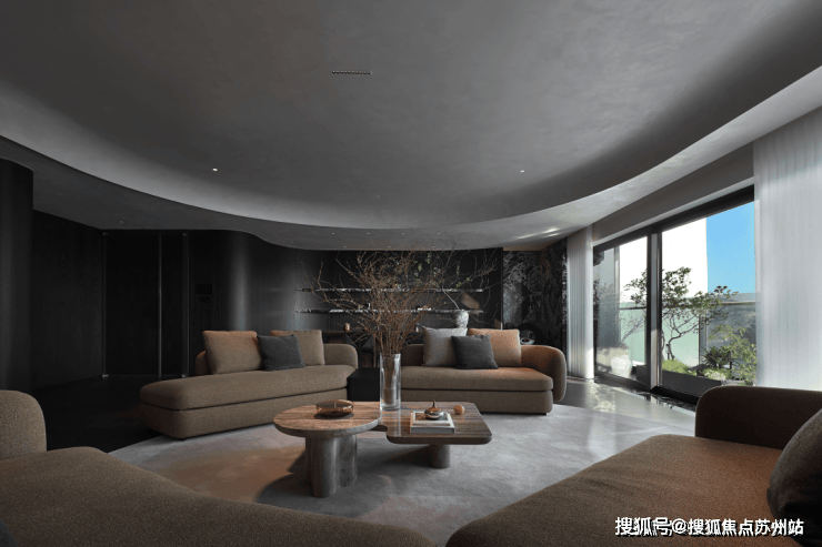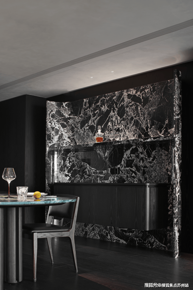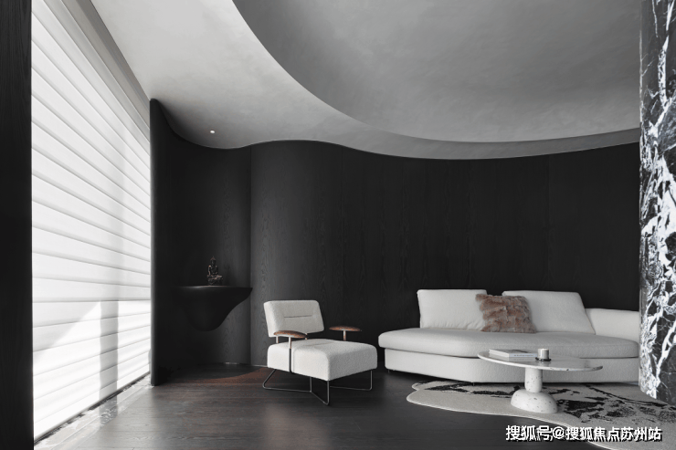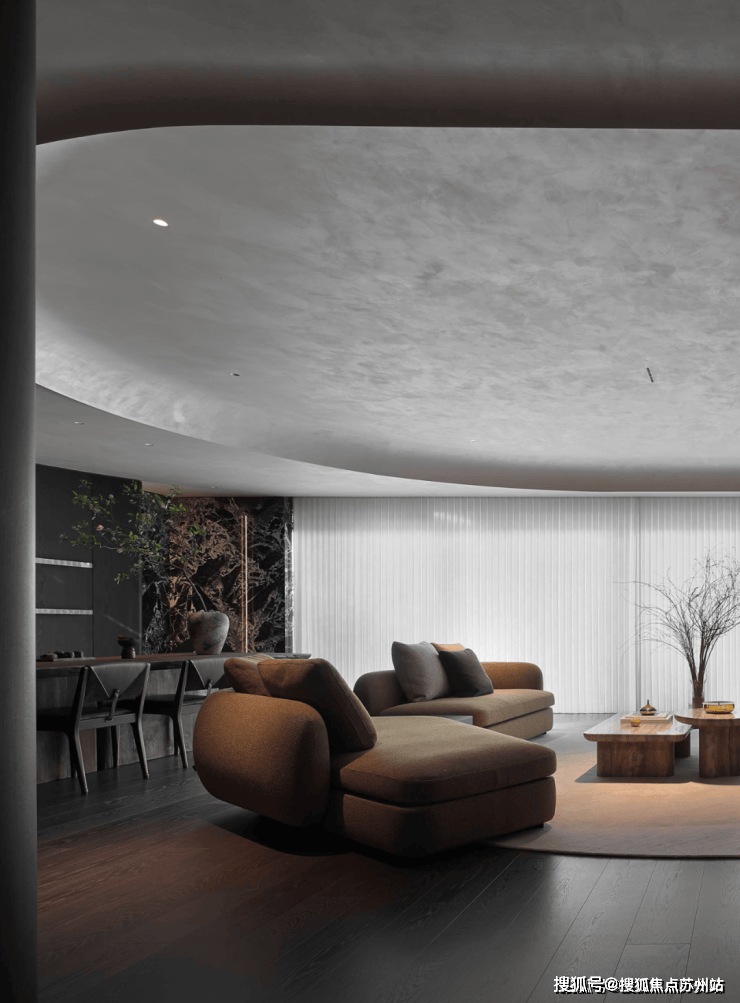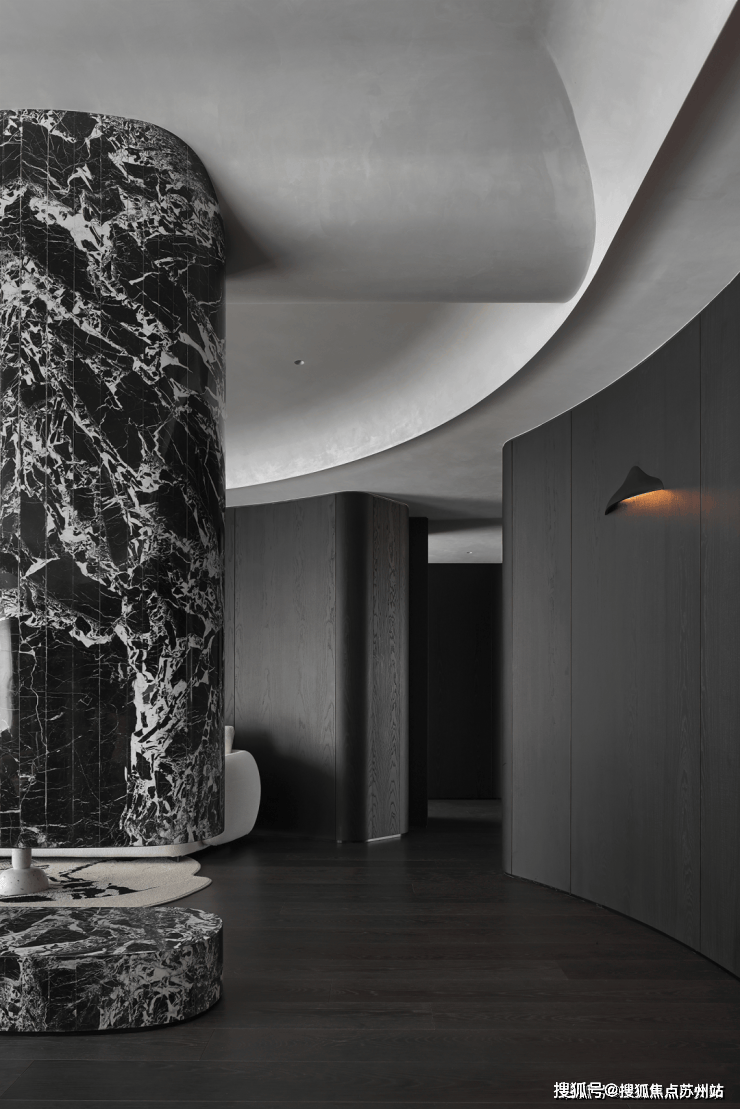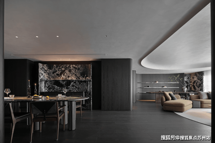 业主的想法与执著设计的理念不谋而合,满足功能性需求后,以“隐于形的诗意”为核心,通过精心策划,打破了线性空间的固有逻辑,于蜿蜒的曲线形态与深色空间画布中,缔造出明朗大气、优雅静谧的氛围感。