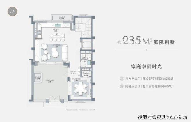 以建面约235㎡的庭院别墅样板房为例,户型附赠地下室、庭院、露台、阁楼空间,附赠面积达到户型总建面的60%左右,市场上少之又少!