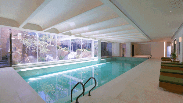 恒温泳池:采用全景落地玻璃墙,巧妙消融了室内与自然的界限。畅游其间,庭院山石如天然屏风倒映眼前,仿佛在自然山水间徜徉。