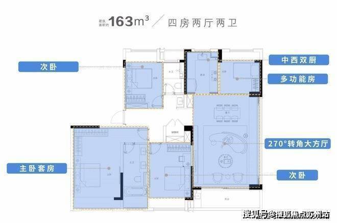 其二,建面约143、163㎡两大户型,起步改善大四房,满屏的领先产品力。