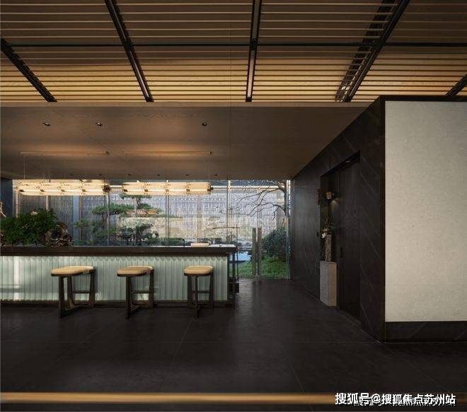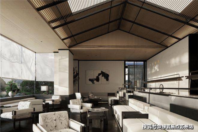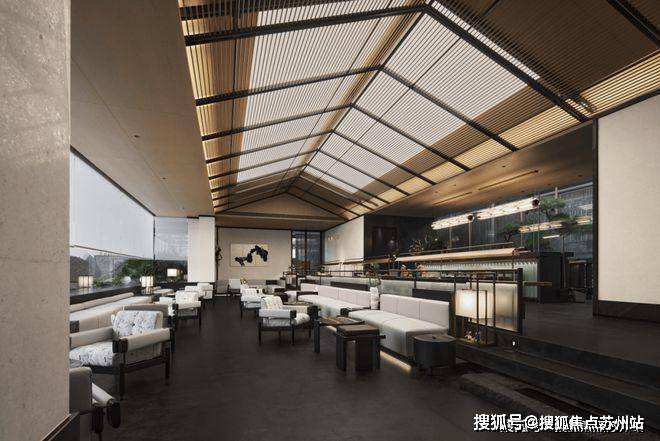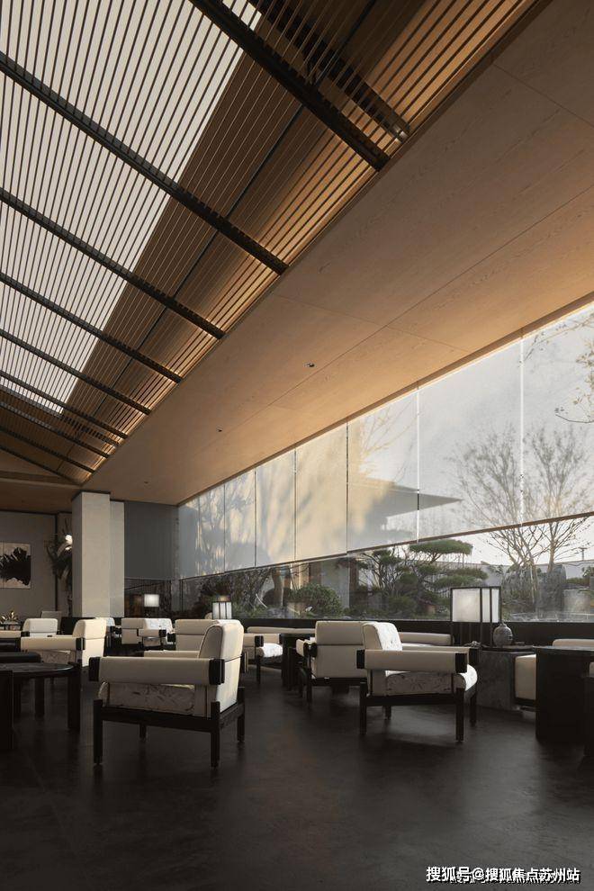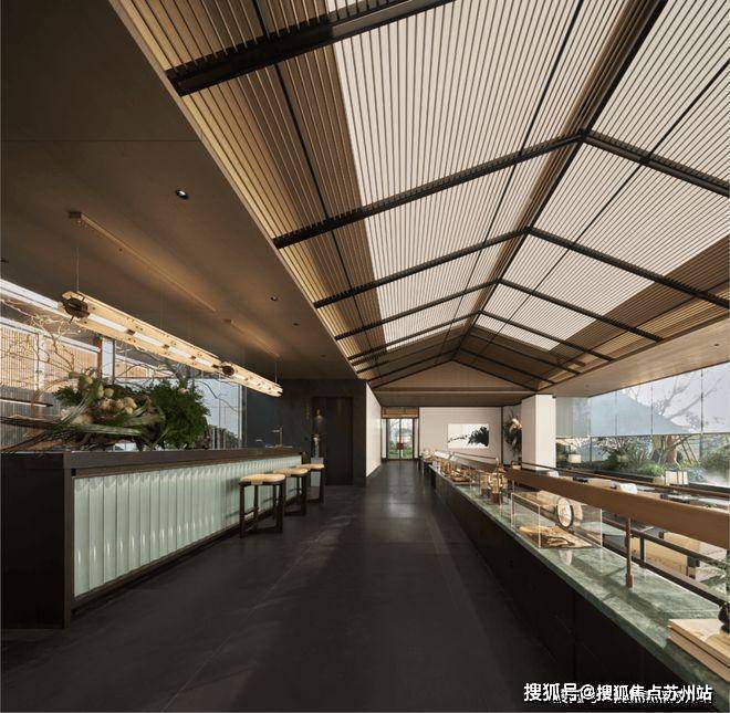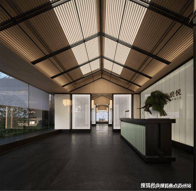 Poly Langyue Sales Office Tel: 400-8828-814 Walking into the space, the straight and towering roof ridge is a unique architectural structure in Suzhou. The concise and pure ceiling grille is used to interpret the concise, solemn and elegant meaning of the space scene.The light and shadow scattered through the metal grille are rendered layer by layer, creating a quiet and spacious space atmosphere.