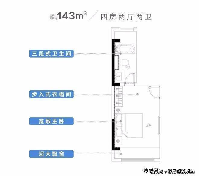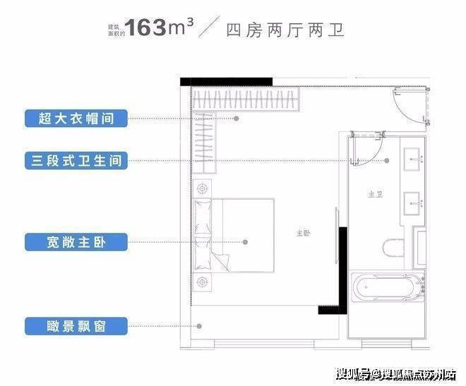 主卧自带全尺寸飘窗+步入式衣帽间,以及独立卫生间,内置大浴缸。