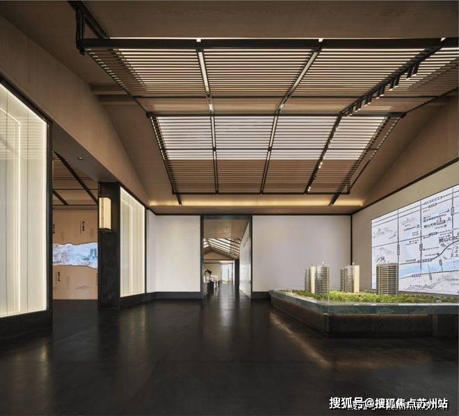 保利琅悦售楼处电话:400-8828-814移步三进,层层屏风的尽头,便至沙盘,延续了接待空间的设计语言,利用黑色石材勾勒出的素色墙体,无不透露出苏式建筑的优雅。