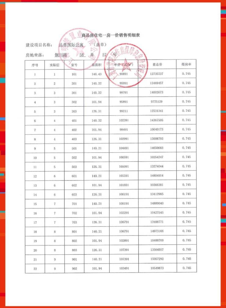 准售房源一房一价表