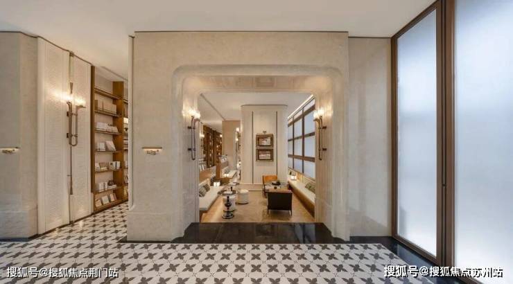比如首开的1号楼,架空层就像一座陈列着书籍的美学空间,雪山兰等奢石铺陈,搭配主题logo拼花石材、叠级吊顶等设计,尽显高阶的温润感。